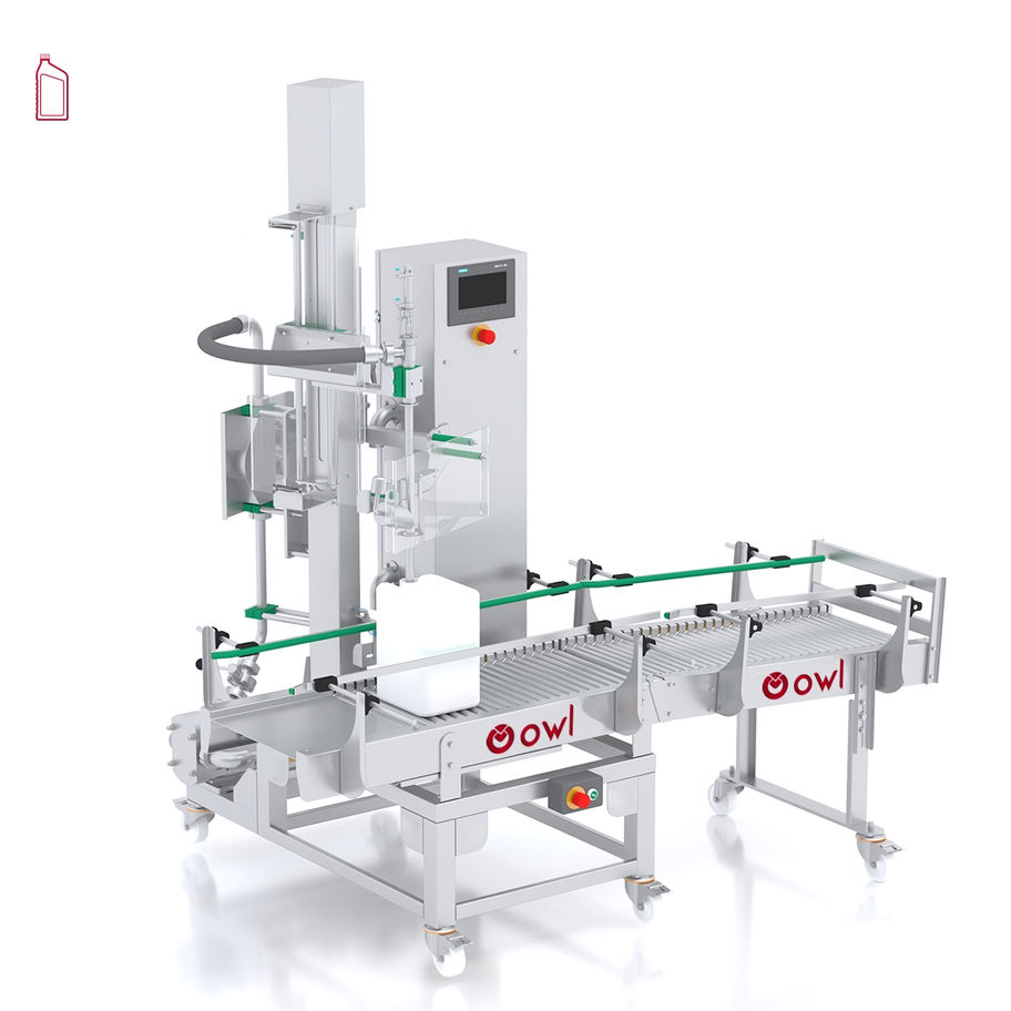 The semi-automatic filling machine with a flowmetric system precisely and quickly fills liquid products of varying viscosities. It is designed to fill industrial packages, such as jerrycans, buckets, tin cans, and others ranging from 0.1 to 30 kg, without dripping. Once the operator places an empty package on the filling platform, and upon completion of the filling operation, the operator slides the filled package onto a roller conveyor to move it outside the machine for capping. When a new empty package is placed on the platform, the filling cycle is either manually or automatically initiated, and the next cycle begins. The machine's filling heads, product feeding system, and operational parameters are configured to meet the requirements of the product being processed and the different forms of packages.
