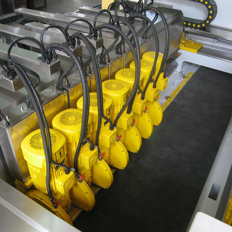 The heads in Excalibur® are not moved on a shaft as they are in non-professional systems. Instead, the movement of the heads (right-left) glides on heavy sledges and rollers (linear sledge and roller) with near-zero friction.