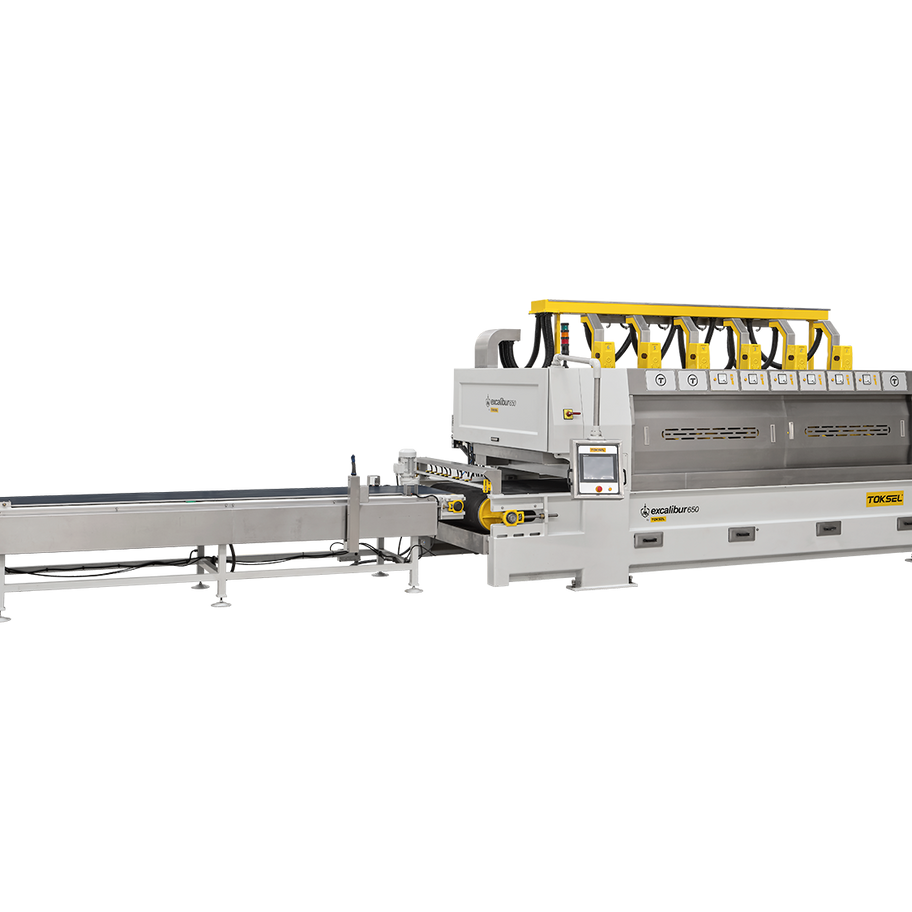 Height-free stones are automatically dimensioned by the Excalibur® size sizing machine according to the dimensions and quantities entered at the beginning of the shift. The length of the raw material can be different in this module, as in other modules. The stone that is perceived by the mapping sensors at the entrance of the Excalibur® comes in front of the Excalibur® miter. According to the dimensions entered at the beginning of the shift, the heads automatically position themselves in a precise position, and the square is moved. In Excalibur® cutting heads, the saw blades return to the zero position after they start cutting. The cutting process is completed with a precision above world cutting standards. Even if more than one piece of stone of different lengths comes in front of the heads, the heads perform the cutting with minimum waste in the desired dimensions.